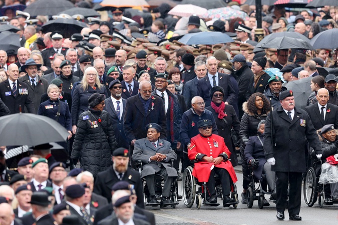 LONDON, ENGLAND - NOVEMBER 12: General view of the veteran parade during the National Service of Remembrance at The Cenotaph on November 12, 2023 in London, England. Every year, members of the British Royal family join politicians, veterans and members of the public to remember those who have died in combat., Credit:Chris Jackson / Avalon