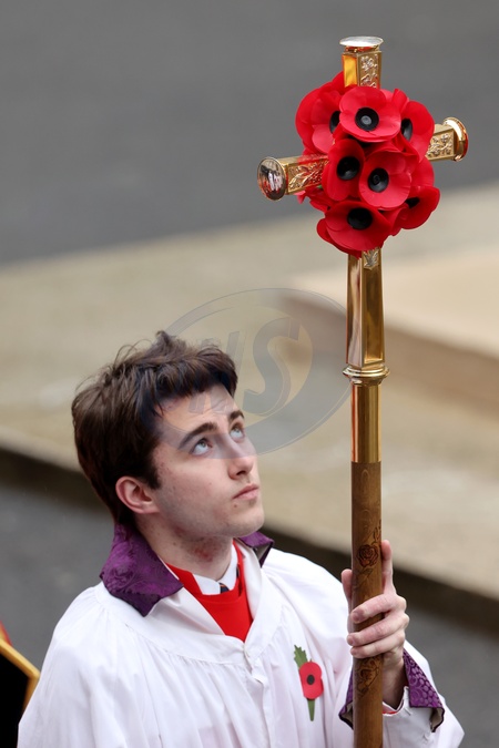 LONDON, ENGLAND - NOVEMBER 12: A boy carries a poppy covered cross during the National Service of Remembrance at The Cenotaph on November 12, 2023 in London, England. Every year, members of the British Royal family join politicians, veterans and members of the public to remember those who have died in combat., Credit:Chris Jackson / Avalon