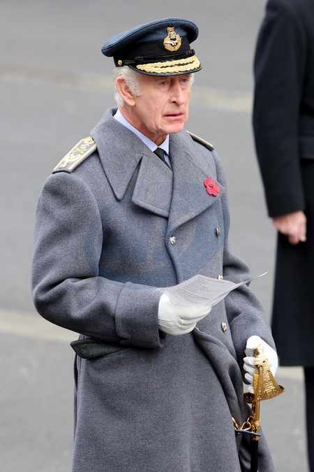 LONDON, ENGLAND - NOVEMBER 12: King Charles III during the National Service of Remembrance at The Cenotaph on November 12, 2023 in London, England. Every year, members of the British Royal family join politicians, veterans and members of the public to remember those who have died in combat., Credit:Chris Jackson / Avalon