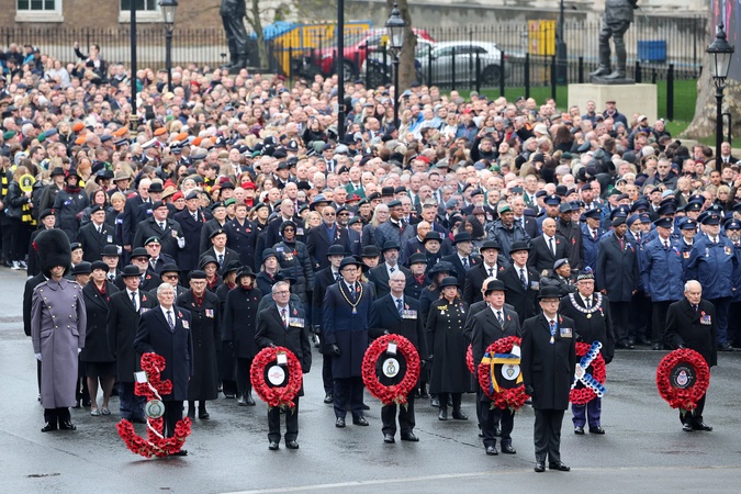 LONDON, ENGLAND - NOVEMBER 12: Veterans carrying wreaths during the National Service of Remembrance at The Cenotaph on November 12, 2023 in London, England. Every year, members of the British Royal family join politicians, veterans and members of the public to remember those who have died in combat., Credit:Chris Jackson / Avalon