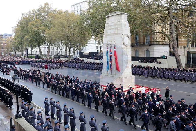 LONDON, ENGLAND - NOVEMBER 12: General view of the veteran parade during the National Service of Remembrance at The Cenotaph on November 12, 2023 in London, England. Every year, members of the British Royal family join politicians, veterans and members of the public to remember those who have died in combat., Credit:Chris Jackson / Avalon