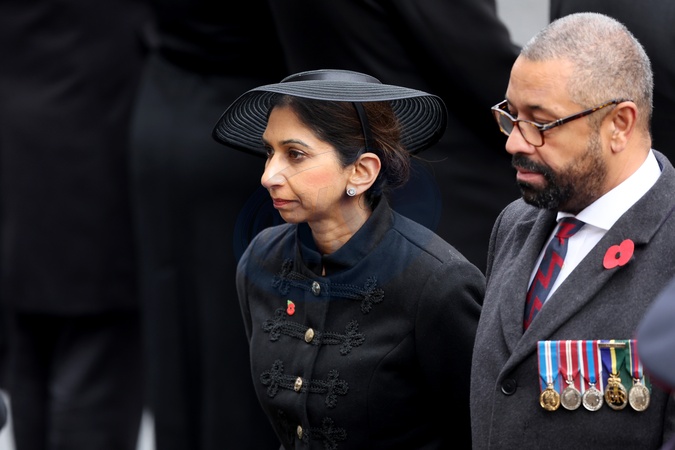 LONDON, ENGLAND - NOVEMBER 12: Suella Braverman MP and James Cleverly MP during the National Service of Remembrance at The Cenotaph on November 12, 2023 in London, England. Every year, members of the British Royal family join politicians, veterans and members of the public to remember those who have died in combat., Credit:Chris Jackson / Avalon