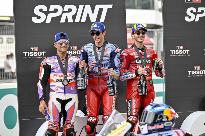 MARQUEZ Alex (spa), Gresini Racing MotoGP, Ducati Desmosedici GP22, podium, portrait Sprint Race with MARTIN Jorge (spa), Pramac Racing, Ducati Desmosedici GP23 and BAGNAIA Francesco (ita), Ducati Lenovo Team, Ducati Desmosedici GP23 during the 2023 MotoGP Petronas Grand Prix of Malaysia on the Sepang International Circuit from November 10 to 12, in Sepang, Malaysia - © DPPI/Panoramic/Bestimage