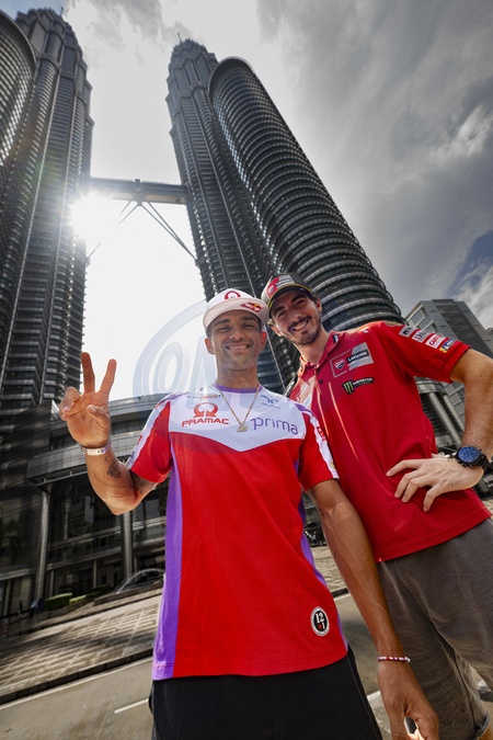 MARTIN Jorge (spa), Pramac Racing, Ducati Desmosedici GP23, portrait and BAGNAIA Francesco (ita), Ducati Lenovo Team, Ducati Desmosedici GP23 in front of the Petronas Tower in Kuala Lumpur downtown during the 2023 MotoGP Petronas Grand Prix of Malaysia on the Sepang International Circuit from November 10 to 12, in Sepang, Malaysia - © DPPI/Panoramic/Bestimage