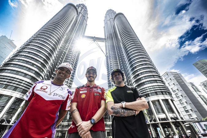 MARTIN Jorge (spa), Pramac Racing, Ducati Desmosedici GP23, portrait with BAGNAIA Francesco (ita), Ducati Lenovo Team, Ducati Desmosedici GP23 and BEZZECCHI Marco (ita), Mooney VR46 Racing Team, Ducati Desmosedici GP22, portrait in front of the Petronas Tower in Kuala Lumpur downtown during the 2023 MotoGP Petronas Grand Prix of Malaysia on the Sepang International Circuit from November 10 to 12, in Sepang, Malaysia - © DPPI/Panoramic/Bestimage