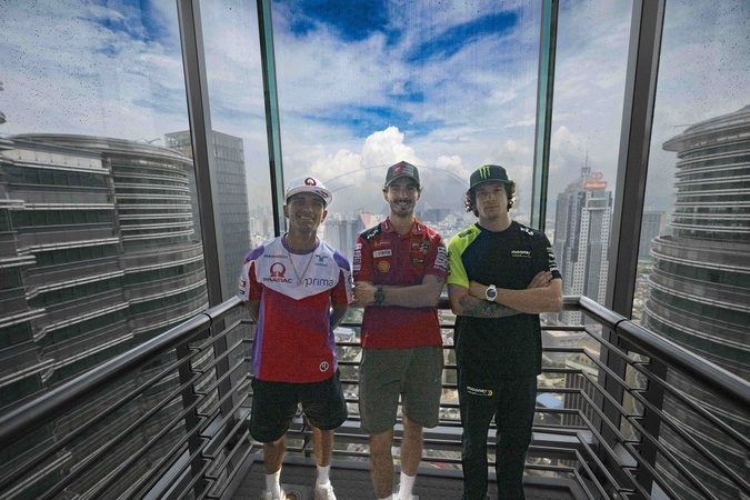MARTIN Jorge (spa), Pramac Racing, Ducati Desmosedici GP23, portrait with BAGNAIA Francesco (ita), Ducati Lenovo Team, Ducati Desmosedici GP23 and BEZZECCHI Marco (ita), Mooney VR46 Racing Team, Ducati Desmosedici GP22, portrait in front of the Petronas Tower in Kuala Lumpur downtown during the 2023 MotoGP Petronas Grand Prix of Malaysia on the Sepang International Circuit from November 10 to 12, in Sepang, Malaysia - © DPPI/Panoramic/Bestimage