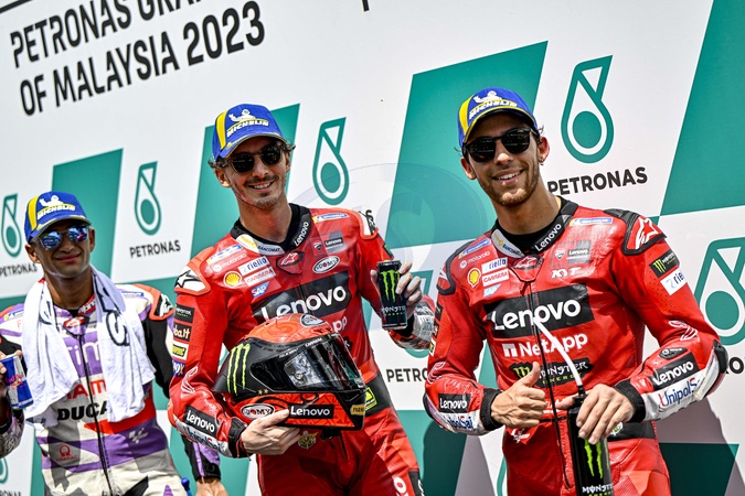 BAGNAIA Francesco (ita), Ducati Lenovo Team, Ducati Desmosedici GP23, portrait, celebrating his pole-position with MARTIN Jorge (spa) and BASTIANINI Enea (ita) during the 2023 MotoGP Petronas Grand Prix of Malaysia on the Sepang International Circuit from November 10 to 12, in Sepang, Malaysia - © DPPI/Panoramic/Bestimage