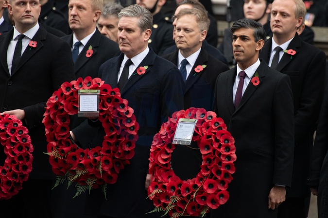 (L-R) -Labour Leader Sir Keir Starmer, Grant Shapps - Secretary of State for Defence, British Prime Minister Rishi Sunak at the Remembrance Sunday Service in Whitehall - Whitehall, London, England, UK on Sunday 12 November, 2023 to commemorate the contribution of British and Commonwealth military and civilian servicemen and women in the two World Wars and later conflict., Credit:Justin Ng / Avalon