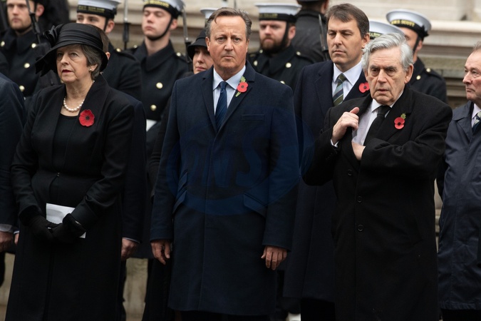 (L-R) - Former Prime Minister Theresa May, Former Prime Minister David Cameron, Former Prime Minister Gordon Brown at the Remembrance Sunday Service in Whitehall - Whitehall, London, England, UK on Sunday 12 November, 2023 to commemorate the contribution of British and Commonwealth military and civilian servicemen and women in the two World Wars and later conflict., Credit:Justin Ng / Avalon