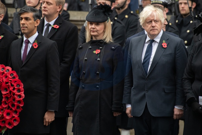 (L-R) - British Prime Minister Rishi Sunak, Former Prime Minister Liz Truss, Former Prime Minister Boris Johnson at the Remembrance Sunday Service in Whitehall - Whitehall, London, England, UK on Sunday 12 November, 2023 to commemorate the contribution of British and Commonwealth military and civilian servicemen and women in the two World Wars and later conflict., Credit:Justin Ng / Avalon