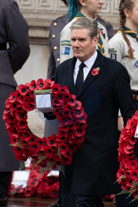 Labour leader Sir Keir Starmer with his wreath which reads 'Our freedom and democracy were secured by the sacrifice and bravery of a generation. We will always remember them' at the Remembrance Sunday Service in Whitehall - Whitehall, London, England, UK on Sunday 12 November, 2023 to commemorate the contribution of British and Commonwealth military and civilian servicemen and women in the two World Wars and later conflict., Credit:Justin Ng / Avalon