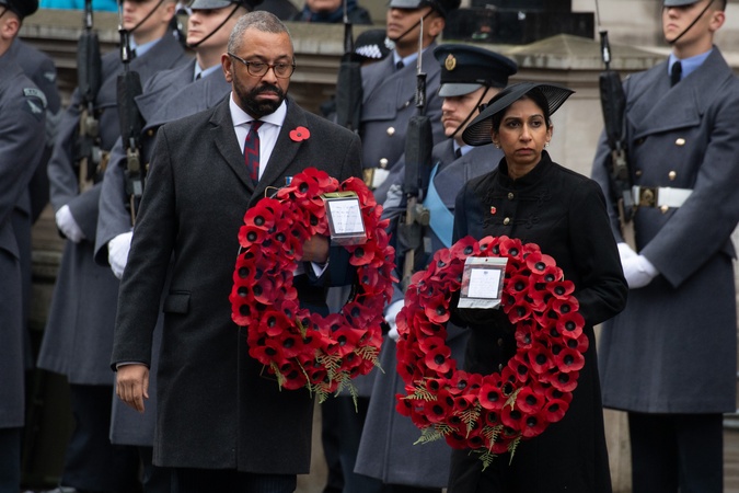 Suella Braverman - Secretary of State for the Home Department with her wreath that reads 'In memory of the heroes to whom we owe everything. Your sacrifice was not in vain. We will remember and honour you always' at the Remembrance Sunday Service in Whitehall - Whitehall, London, England, UK on Sunday 12 November, 2023 to commemorate the contribution of British and Commonwealth military and civilian servicemen and women in the two World Wars and later conflict., Credit:Justin Ng / Avalon
