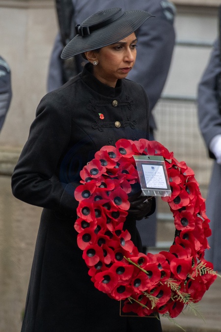 Suella Braverman - Secretary of State for the Home Department with her wreath that reads 'In memory of the heroes to whom we owe everything. Your sacrifice was not in vain. We will remember and honour you always' at the Remembrance Sunday Service in Whitehall - Whitehall, London, England, UK on Sunday 12 November, 2023 to commemorate the contribution of British and Commonwealth military and civilian servicemen and women in the two World Wars and later conflict., Credit:Justin Ng / Avalon