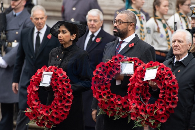 Suella Braverman - Secretary of State for the Home Department with her wreath that reads 'In memory of the heroes to whom we owe everything. Your sacrifice was not in vain. We will remember and honour you always' at the Remembrance Sunday Service in Whitehall - Whitehall, London, England, UK on Sunday 12 November, 2023 to commemorate the contribution of British and Commonwealth military and civilian servicemen and women in the two World Wars and later conflict., Credit:Justin Ng / Avalon