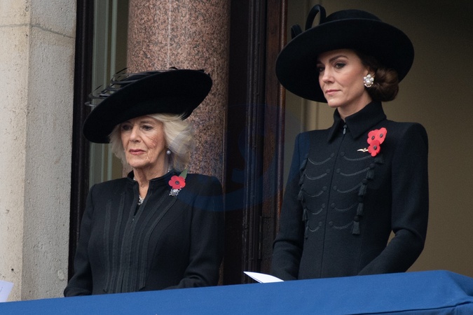 (L-R) - Queen Camilla, Princess Catherine - The Princess of Wales at the Remembrance Sunday Service in Whitehall - Whitehall, London, England, UK on Sunday 12 November, 2023 to commemorate the contribution of British and Commonwealth military and civilian servicemen and women in the two World Wars and later conflict., Credit:Justin Ng / Avalon