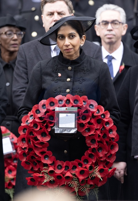Home Secretary Stella Braverman stands at the Cenotaph in London with her wreath on Remembrance Sunday., Credit:Richard Pohle / Avalon