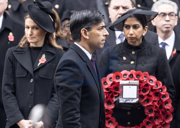 Prime Minister Rishi Sunk walks past Home Secretary Stella Braverman after laying his wreath at the Cenotaph on Remembrance Sunday, Credit:Richard Pohle / Avalon