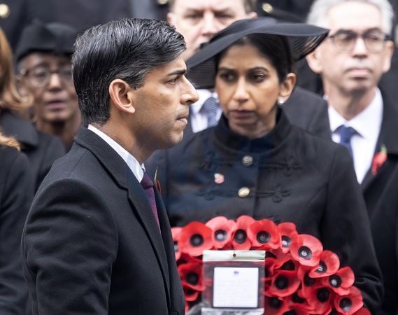 Prime Minister Rishi Sunak walks past Home Secretary Suella Braverman after laying his wreath at the Cenotaph on Remembrance Sunday, Credit:Richard Pohle / Avalon