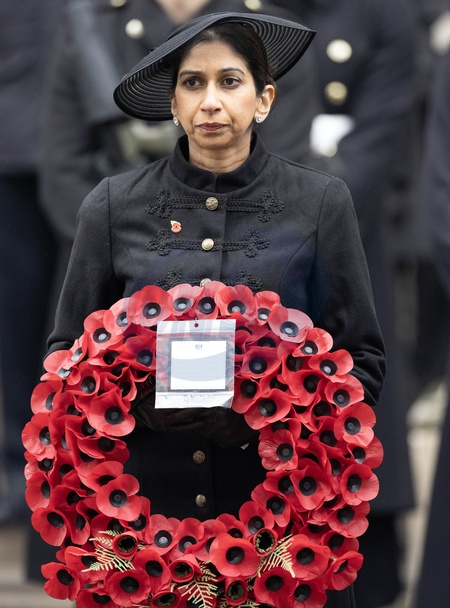 Home Secretary Suella Braverman stands at the Cenotaph in London with her wreath on Remembrance Sunday., Credit:Richard Pohle / Avalon