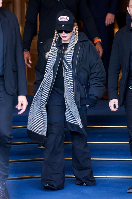 Madonna entourée de ses gardes du corps à la sortie de l'hôtel Ritz à Paris, France, le 13 novembre 2023. L'icône pop est en route pour sa deuxième date parisienne à l'Accor Arena de sa tournée "The Celebration Tour". Madonna surrounded by her bodyguards as she exits the Ritz hotel in Paris, France, on November 13, 2023. The pop icon is on her way to her second Parisian date at the Accor Arena of her "The Celebration Tour" .