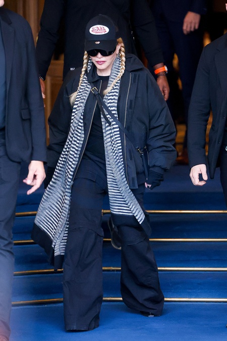 Madonna entourée de ses gardes du corps à la sortie de l'hôtel Ritz à Paris, France, le 13 novembre 2023. L'icône pop est en route pour sa deuxième date parisienne à l'Accor Arena de sa tournée "The Celebration Tour". Madonna surrounded by her bodyguards as she exits the Ritz hotel in Paris, France, on November 13, 2023. The pop icon is on her way to her second Parisian date at the Accor Arena of her "The Celebration Tour" .