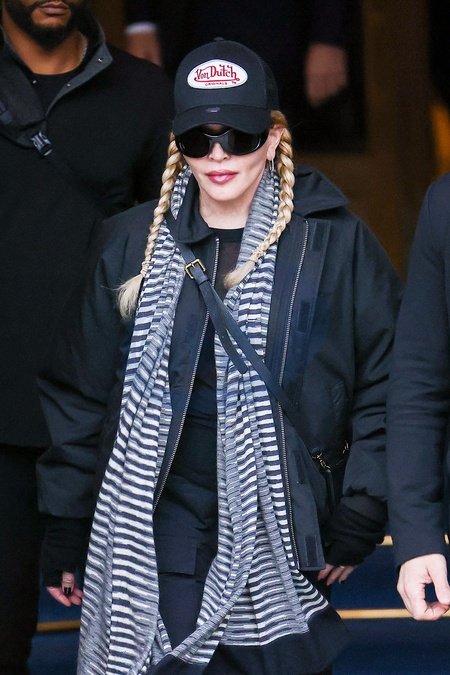 Madonna entourée de ses gardes du corps à la sortie de l'hôtel Ritz à Paris, France, le 13 novembre 2023. L'icône pop est en route pour sa deuxième date parisienne à l'Accor Arena de sa tournée "The Celebration Tour". Madonna surrounded by her bodyguards as she exits the Ritz hotel in Paris, France, on November 13, 2023. The pop icon is on her way to her second Parisian date at the Accor Arena of her "The Celebration Tour" .