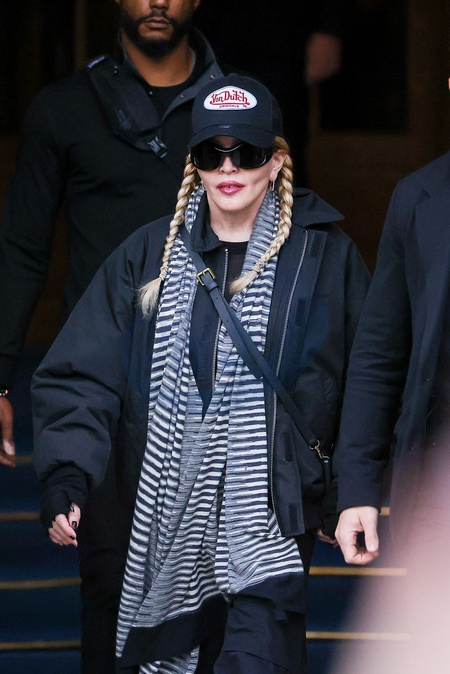 Madonna entourée de ses gardes du corps à la sortie de l'hôtel Ritz à Paris, France, le 13 novembre 2023. L'icône pop est en route pour sa deuxième date parisienne à l'Accor Arena de sa tournée "The Celebration Tour". Madonna surrounded by her bodyguards as she exits the Ritz hotel in Paris, France, on November 13, 2023. The pop icon is on her way to her second Parisian date at the Accor Arena of her "The Celebration Tour" .