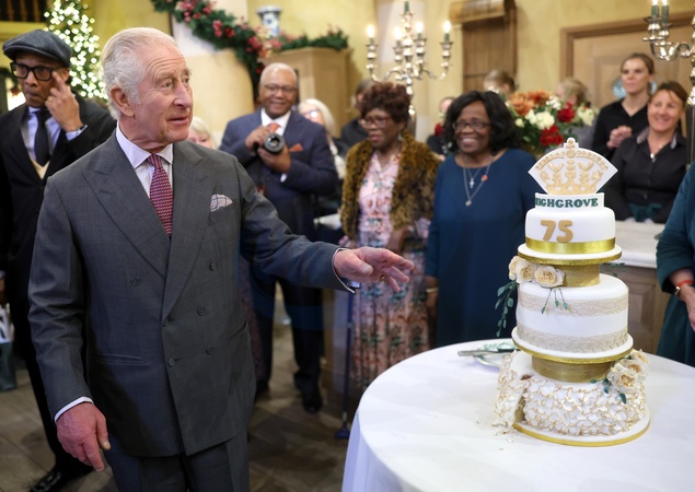 TETBURY, ENGLAND - NOVEMBER 13: King Charles III poses with his cake as he attends his 75th birthday party hosted by the Prince's Foundation at Highgrove House on November 13, 2023 in Tetbury, England. Guests include local residents who have been nominated by friends and family and individuals and organisations also turning 75 in 2023., Credit:Chris Jackson / Avalon