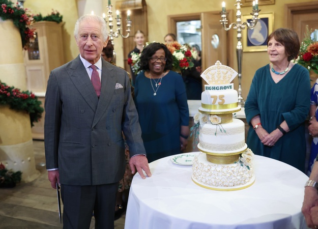 TETBURY, ENGLAND - NOVEMBER 13: King Charles III poses with his cake as he attends his 75th birthday party hosted by the Prince's Foundation at Highgrove House on November 13, 2023 in Tetbury, England. Guests include local residents who have been nominated by friends and family and individuals and organisations also turning 75 in 2023., Credit:Chris Jackson / Avalon