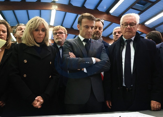 Le président français Emmanuel Macron et sa femme la Première Dame Brigitte assistent à une réunion avec les équipes de secours à Clairmarais, France, le 14 novembre 2023. Le président Macron et sa femme la Première Dame Brigitte, visitent des villes inondées près de Calais, dans le nord de la France, après une série de tempêtes et de fortes pluies qui ont forcé l'évacuation des écoles, des champs agricoles inondés et des services publics mis à rude épreuve. Macron veut montrer son soutien aux habitants et aux équipes de secours, Le président de la République française Emmanuel Macron annonce le classement de 244 communes en catastrophe naturelle dans le Nord et Pas-de-Calais. France's President Emmanuel Macron , center right, and his wife Brigitte, center left, attend a meeting with rescue teams in Clairmarais, northern France, Tuesday, Nov. 14, 2023. President Macron and his wife, Brigitte, visit inundated towns near Calais in northern France after a series of storms and heavy rains forced school evacuations, flooded farm fields and strained public services. Macron wants to show his support to residents and rescue teams, the French presidency said.