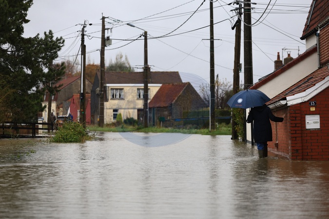 Le président français rencontre les équipes de secours à Le Doulac, France, le 14 novembre 2023. Le président Macron et sa femme la Première Dame, visitent des villes inondées près de Calais, dans le nord de la France, après une série de tempêtes et de fortes pluies qui ont forcé l'évacuation des écoles, des champs agricoles inondés et des services publics mis à rude épreuve. Macron veut montrer son soutien aux habitants et aux équipes de secours, Le président de la République française Emmanuel Macron annonce le classement de 244 communes en catastrophe naturelle dans le Nord et Pas-de-Calais A woman walks in a flooded street of Le Doulac, northern France, Tuesday, Nov. 14, 2023. President Macron and his wife, Brigitte, visit inundated towns near Calais in northern France after a series of storms and heavy rains forced school evacuations, flooded farm fields and strained public services. Macron wants to show his support to residents and rescue teams, the French presidency said.
