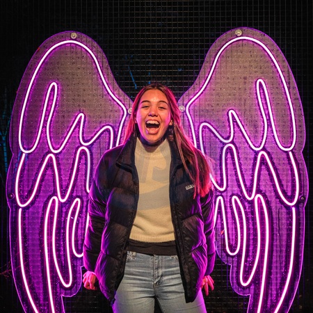 London, UK 14th Nov 2023. A Kew model has fun posing with illuminated angel wings. The popular 'Christmas at Kew' returns to Kew Gardens in West London. The original festive trail through Kew's after-dark landscape is returning for its eleventh year with a host of seasonal favourites alongside several new light installations., Credit:Imageplotter / Avalon