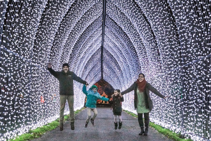 London, UK 14th Nov 2023. Manuel and Gabriella Lujan Ghisella, with their children Oliver and Isabella in the ever popular 'Christmas Cathedral' light installation, inspired by an arched church window. The popular 'Christmas at Kew' returns to Kew Gardens in West London. The original festive trail through Kew's after-dark landscape is returning for its eleventh year with a host of seasonal favourites alongside several new light installations., Credit:Imageplotter / Avalon