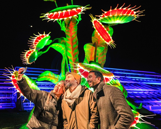London, UK 14th Nov 2023. Kew models take selfies with the vibrant 'Snapper' installation. This John Lewis installation is a replica of the much loved Snapper, a venus fly trap and wannabe Christmas Tree who is the star of their Christmas ad this year. The popular 'Christmas at Kew' returns to Kew Gardens in West London. The original festive trail through Kew's after-dark landscape is returning for its eleventh year with a host of seasonal favourites alongside several new light installations., Credit:Imageplotter / Avalon