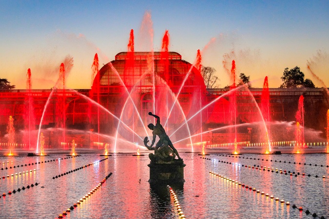 London, UK 14th Nov 2023. The trail's grand finale is the 'Christmas Symphony' with projections and lights dancing across the water in front of Kew's Palm House. The popular 'Christmas at Kew' returns to Kew Gardens in West London. The original festive trail through Kew's after-dark landscape is returning for its eleventh year with a host of seasonal favourites alongside several new light installations., Credit:Imageplotter / Avalon