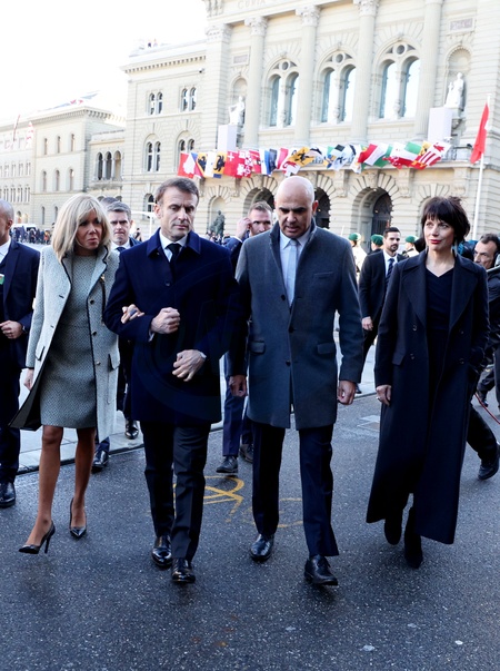 Alain Berset, Président de la Confédération suisse, sa femme Muriel Zeender Berset - Cérémonie d'accueil du président Emmanuel Macron et de sa femme Brigitte Macron sur la place fédérale de Berne, Suisse le 15 novembre 2023. Le président de la République Française et sa femme sont en visite d'état à l'invitation du Conseil fédéral suisse. La Confédération suisse accueille la première communité française à l'étranger, avec près de 200 000 inscrits au registre consulaire. La Suisse est un partenaire économique très important, et nos relations denses avec des investissements croisés très importants, faisant de la Suisse le 3ème investisseur en France et réciproquement. Par ailleurs, la France et la Suisse sont Etats hôtes de l'Organisation européenne pour la recherche nucléaire (CERN) à Genève, modèle d'innovation technologique dans le monde entier. Dans le contexte international actuel, cette visite sera l'occasion d'échanger sur le renforcement de la coopération entre la France et la Suisse face aux grandes crises, notamment sur la guerre en Ukraine ou la situation au Proche-Orient. La visite du chef de l'Etat s'inscrit également dans une nouvelle dynamique des coopérations avec la Suisse à l'échelle continentale, puisque la Confédération s'est pleinement investie au sein de la Communauté politique européenne, et la relance des discussions entre la Suisse et l'Union européenne. © Dominique Jacovides / Bestimage Welcome ceremony for President Emmanuel Macron and his wife Brigitte Macron on the Bundesplatz in Bern, Switzerland on 15 November 2023. The President of the French Republic and his wife are on a state visit at the invitation of the Swiss Federal Council. The Swiss Confederation is home to France's largest community abroad, with almost 200,000 people on its consular register. Switzerland is a very important economic partner, and our relations are very close, with substantial cross-investment, making Switzerland the 3rd largest investor in France and vice versa. France and Switzerland are also host states to the European Organization for Nuclear Research (CERN) in Geneva, a model of technological innovation for the entire world. In the current international context, this visit will provide an opportunity to exchange views on strengthening cooperation between France and Switzerland in the face of major crises, in particular the war in Ukraine and the situation in the Middle East. The Head of State's visit is also part of a new dynamic of cooperation with Switzerland on a continental scale, since the Confederation has fully invested itself within the European Political Community, and the relaunch of discussions between Switzerland and the European Union.