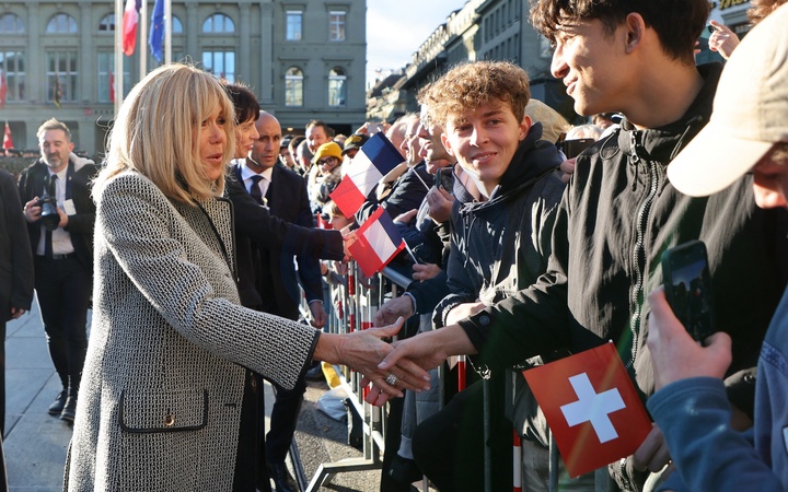 Cérémonie d'accueil du président Emmanuel Macron et de sa femme Brigitte Macron sur la place fédérale de Berne, Suisse