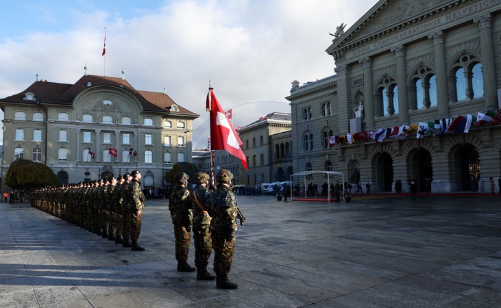 Cérémonie d'accueil du président Emmanuel Macron et de sa femme Brigitte Macron sur la place fédérale de Berne, Suisse
