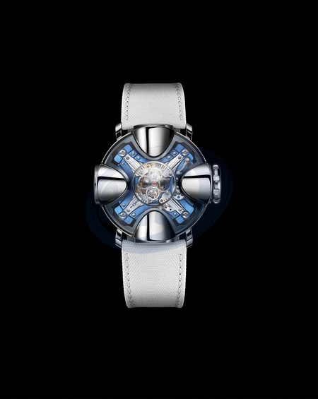 Pictures MUST credit: MB&F Flamboyant Swiss watch company MB&F has come up with a timepiece with FOUR bulbous displays around the case. One is the watch face, another gives the temperature, a third is a power bank and the fourth is the crown for adjusting the hands. At the centre of the timepiece is MB&F's battle-axe symbol which is surrounded by sapphire crystal to give a window into the movement. The entire case can make a 360 degree pivot to change its display and at the same time wind the watch. The piece is called the HM11 Architect.