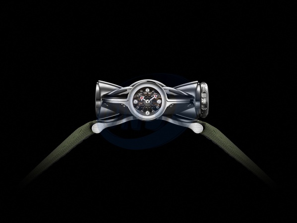 Pictures MUST credit: MB&F Flamboyant Swiss watch company MB&F has come up with a timepiece with FOUR bulbous displays around the case. One is the watch face, another gives the temperature, a third is a power bank and the fourth is the crown for adjusting the hands. At the centre of the timepiece is MB&F's battle-axe symbol which is surrounded by sapphire crystal to give a window into the movement. The entire case can make a 360 degree pivot to change its display and at the same time wind the watch. The piece is called the HM11 Architect.