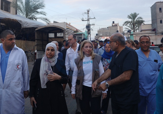 Catherine Russell, UNICEF Executive Director, and Ted Chaiban, UNICEF Deputy Executive Director for Humanitarian Action and Supply Operations, visit Al Naser Hospital in Khan Younis in southern Gaza Strip on 14 November 2023. Statement by UNICEF Executive Director Catherine Russell on her visit to Gaza GAZA, 15 November 2023 – "Today I visited the Gaza Strip to meet with children, their families and UNICEF staff. What I saw and heard was devastating. They have endured repeated bombardment, loss and displacement. Inside the Strip, there is nowhere safe for Gaza's one million children to turn. "The parties to the conflict are committing grave violations against children; these include killing, maiming, abductions, attacks on schools and hospitals, and the denial of humanitarian access – all of which UNICEF condemns. "In Gaza, more than 4,600 children have reportedly been killed, with nearly 9,000 reportedly injured. "Many children are missing and believed buried under the rubble of collapsed buildings and homes, the tragic result of the use of explosive weapons in populated areas. Meanwhile, newborn babies who require specialized care have died in one of Gaza's hospitals as power and medical supplies run out, and violence continues with indiscriminate effect. "At the Al Naser hospital in Khan Yunis, I met with patients and displaced families seeking shelter and safety. A 16-year-old girl told me from her hospital bed that her neighborhood had been bombed. She survived but doctors say she will never be able to walk again. "In the hospital's neonatal ward, tiny babies were clinging to life in incubators, as doctors worried how they could keep the machines running without fuel. "During my time in Gaza, I also met with UNICEF staff who are continuing to deliver for children amidst the danger and devastation. They shared their own heartbreaking stories with me of the impact of the war on their children, of family members killed, and of how they have been displaced many times over. "Many people, including our staff and their families, are now living in overcrowded shelters with very little water, food or decent sanitation – conditions which could lead to disease outbreaks. "The risk to humanitarian actors inside Gaza cannot be overstated. More than 100 UNRWA staff have been killed since October. "UNICEF and our partners are doing everything we can, including bringing in desperately needed humanitarian supplies. But diesel fuel has practically run out, causing some hospitals and health centers to stop functioning. Without fuel, desalination plants cannot produce drinking water and humanitarian supplies cannot be distributed. "The intermittent opening of Gaza's border crossings to shipments of humanitarian supplies is insufficient to meet the skyrocketing needs. And with winter around the corner, the need for fuel could become even more acute. When I left Gaza today, the rain was pounding down, adding to the misery. "I am here to do whatever I can to advocate for the protection of children. I once again call on all parties to ensure that children are protected and assisted, as per international humanitarian law. Only the parties to the conflict can truly stop this horror. "I also call on the parties to implement an immediate humanitarian ceasefire, to safely release all abducted and detained children, and to ensure that humanitarian actors have safe, sustained and unimpeded access to reach those in need with the full range of lifesaving services and supplies.” © UNICEF via Bestimage