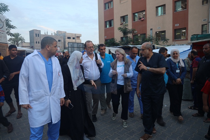 Catherine Russell, UNICEF Executive Director, and Ted Chaiban, UNICEF Deputy Executive Director for Humanitarian Action and Supply Operations, visit Al Naser Hospital in Khan Younis in southern Gaza Strip on 14 November 2023. Statement by UNICEF Executive Director Catherine Russell on her visit to Gaza GAZA, 15 November 2023 – "Today I visited the Gaza Strip to meet with children, their families and UNICEF staff. What I saw and heard was devastating. They have endured repeated bombardment, loss and displacement. Inside the Strip, there is nowhere safe for Gaza's one million children to turn. "The parties to the conflict are committing grave violations against children; these include killing, maiming, abductions, attacks on schools and hospitals, and the denial of humanitarian access – all of which UNICEF condemns. "In Gaza, more than 4,600 children have reportedly been killed, with nearly 9,000 reportedly injured. "Many children are missing and believed buried under the rubble of collapsed buildings and homes, the tragic result of the use of explosive weapons in populated areas. Meanwhile, newborn babies who require specialized care have died in one of Gaza's hospitals as power and medical supplies run out, and violence continues with indiscriminate effect. "At the Al Naser hospital in Khan Yunis, I met with patients and displaced families seeking shelter and safety. A 16-year-old girl told me from her hospital bed that her neighborhood had been bombed. She survived but doctors say she will never be able to walk again. "In the hospital's neonatal ward, tiny babies were clinging to life in incubators, as doctors worried how they could keep the machines running without fuel. "During my time in Gaza, I also met with UNICEF staff who are continuing to deliver for children amidst the danger and devastation. They shared their own heartbreaking stories with me of the impact of the war on their children, of family members killed, and of how they have been displaced many times over. "Many people, including our staff and their families, are now living in overcrowded shelters with very little water, food or decent sanitation – conditions which could lead to disease outbreaks. "The risk to humanitarian actors inside Gaza cannot be overstated. More than 100 UNRWA staff have been killed since October. "UNICEF and our partners are doing everything we can, including bringing in desperately needed humanitarian supplies. But diesel fuel has practically run out, causing some hospitals and health centers to stop functioning. Without fuel, desalination plants cannot produce drinking water and humanitarian supplies cannot be distributed. "The intermittent opening of Gaza's border crossings to shipments of humanitarian supplies is insufficient to meet the skyrocketing needs. And with winter around the corner, the need for fuel could become even more acute. When I left Gaza today, the rain was pounding down, adding to the misery. "I am here to do whatever I can to advocate for the protection of children. I once again call on all parties to ensure that children are protected and assisted, as per international humanitarian law. Only the parties to the conflict can truly stop this horror. "I also call on the parties to implement an immediate humanitarian ceasefire, to safely release all abducted and detained children, and to ensure that humanitarian actors have safe, sustained and unimpeded access to reach those in need with the full range of lifesaving services and supplies.” © UNICEF via Bestimage