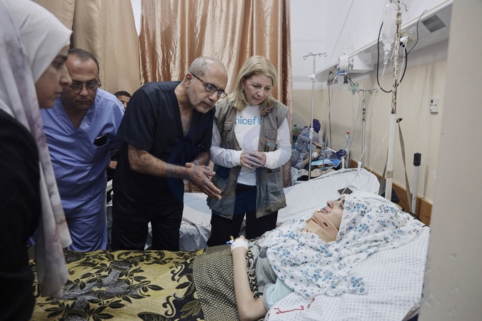 Catherine Russell, UNICEF Executive Director, and Ted Chaiban, UNICEF Deputy Executive Director for Humanitarian Action and Supply Operations, visit Al Naser Hospital in Khan Younis in southern Gaza Strip on 14 November 2023. Statement by UNICEF Executive Director Catherine Russell on her visit to Gaza GAZA, 15 November 2023 – "Today I visited the Gaza Strip to meet with children, their families and UNICEF staff. What I saw and heard was devastating. They have endured repeated bombardment, loss and displacement. Inside the Strip, there is nowhere safe for Gaza's one million children to turn. "The parties to the conflict are committing grave violations against children; these include killing, maiming, abductions, attacks on schools and hospitals, and the denial of humanitarian access – all of which UNICEF condemns. "In Gaza, more than 4,600 children have reportedly been killed, with nearly 9,000 reportedly injured. "Many children are missing and believed buried under the rubble of collapsed buildings and homes, the tragic result of the use of explosive weapons in populated areas. Meanwhile, newborn babies who require specialized care have died in one of Gaza's hospitals as power and medical supplies run out, and violence continues with indiscriminate effect. "At the Al Naser hospital in Khan Yunis, I met with patients and displaced families seeking shelter and safety. A 16-year-old girl told me from her hospital bed that her neighborhood had been bombed. She survived but doctors say she will never be able to walk again. "In the hospital's neonatal ward, tiny babies were clinging to life in incubators, as doctors worried how they could keep the machines running without fuel. "During my time in Gaza, I also met with UNICEF staff who are continuing to deliver for children amidst the danger and devastation. They shared their own heartbreaking stories with me of the impact of the war on their children, of family members killed, and of how they have been displaced many times over. "Many people, including our staff and their families, are now living in overcrowded shelters with very little water, food or decent sanitation – conditions which could lead to disease outbreaks. "The risk to humanitarian actors inside Gaza cannot be overstated. More than 100 UNRWA staff have been killed since October. "UNICEF and our partners are doing everything we can, including bringing in desperately needed humanitarian supplies. But diesel fuel has practically run out, causing some hospitals and health centers to stop functioning. Without fuel, desalination plants cannot produce drinking water and humanitarian supplies cannot be distributed. "The intermittent opening of Gaza's border crossings to shipments of humanitarian supplies is insufficient to meet the skyrocketing needs. And with winter around the corner, the need for fuel could become even more acute. When I left Gaza today, the rain was pounding down, adding to the misery. "I am here to do whatever I can to advocate for the protection of children. I once again call on all parties to ensure that children are protected and assisted, as per international humanitarian law. Only the parties to the conflict can truly stop this horror. "I also call on the parties to implement an immediate humanitarian ceasefire, to safely release all abducted and detained children, and to ensure that humanitarian actors have safe, sustained and unimpeded access to reach those in need with the full range of lifesaving services and supplies.” © UNICEF via Bestimage