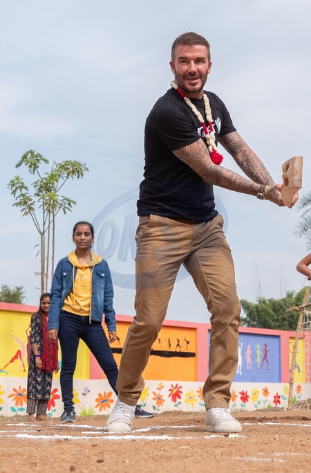 On 14 November 2023 in India, UNICEF Goodwill Ambassador David Beckham (centre) plays cricket with adolescents at the community centre in the Banaskantha district of Gujarat state. Mr. Beckham has come to meet adolescents who are champions of child rights and to hear their personal stories of empowerment – how they have stood up to reject child labour and child marriage and have fought to prevent gender-based violence – as well as descriptions of the support they have received from the community in various ways, including through mental health and psychosocial support (MHPSS). Mr. Beckham travelled to India this week to meet children and adolescents, including girls who are bringing about change and innovation in their communities, and young women who have overcome barriers to help close gender gaps. During his four-day visit, Beckham saw first-hand how UNICEF-supported programmes are making a difference for girls and women, in partnership with the Government of India. The aim of the visit to the community centre was to give a deeper understanding of the context and effective initiatives by community, government and civil society organizations to ensure that every child is protected and empowered (with a gender and equity focus). Adolescents shared their dreams, aspirations, journey so far and the obstacles they have overcome along the way. Community members, front line workers and government functionaries added their experiences, perspectives and insights on the changing times and how the community supports adolescents on their path to greater empowerment, as well as challenges they have faced and how they have overcome them. © Anindita Mukherjee/UNICEF via Bestimage