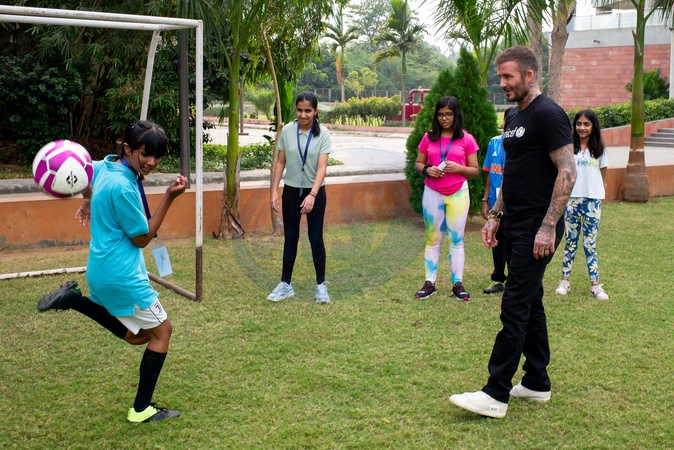 On 13 November 2023 in India, UNICEF Goodwill Ambassador David Beckham (in UNICEF T-shirt) kicks around with children after playing a friendly game of football at Gujarat University in Ahmedabad. During his visit to the University, Mr. Beckham also met youth innovators as well as women entrepreneurs participating in the herSTART programme, who presented their ideas and prototypes at the Vikram Sarabhai Children Innovation Centre (VSCIC) of the Gujarat University Start Up and Entrepreneurship Council (GUSEC). Mr. Beckham travelled to India this week to meet children and adolescents, including girls who are bringing about change and innovation in their communities, and young women who have overcome barriers to help close gender gaps. During his four-day visit, Beckham saw first-hand how UNICEF-supported programmes are making a difference for girls and women, in partnership with the Government of India. UNICEF and its local partner, Elixir, have collaboratively set up the ‘Gujarat Youth Forum' (GYF) to inspire young people to become change-makers. For the past two years, GYF has worked intensively with young people through various initiatives, programmes and campaigns. Adolescents and young people are one of UNICEF's key partners in achieving results and driving sustainable change. UNICEF is enhancing the capacities of governments, service providers and partners to engage with children and young people, and to create opportunities and platforms to ensure their meaningful participation in the decisions that affect their lives and their communities. © Anindita Mukherjee/UNICEF via Bestimage