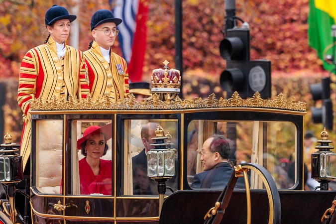 The Mall, London, UK. 21st November 2023.Their Royal Highnesses, The Prince and Princess of Wales, along with South Korean Deputy Prime Minister, Choo Kyung-ho, ride in a carriage procession along The Mall following a formal welcome of The President of the Republic of Korea, His Excellency Yoon Suk Yeol, and the First Lady, Mrs Kim Keon Hee, by Their Majesty's King Charles III and Queen Camilla on Horse Guards Parade on the first full day of the South Korean State Visit to the UK., Credit:Photo by Amanda Rose / Avalon