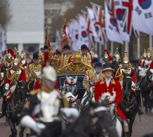 London, UK. 21st Nov, 2023. The President of the Republic of Korea, Yoon Suk Yeol, and the First Lady arrives at Buckingham Palace along The Mall at the start of his State Visit to the UK accompanied by King Charles III, Queen Camilla and The Prince and Princess of Wales by procession., Credit:MALCOLM PARK / Avalon