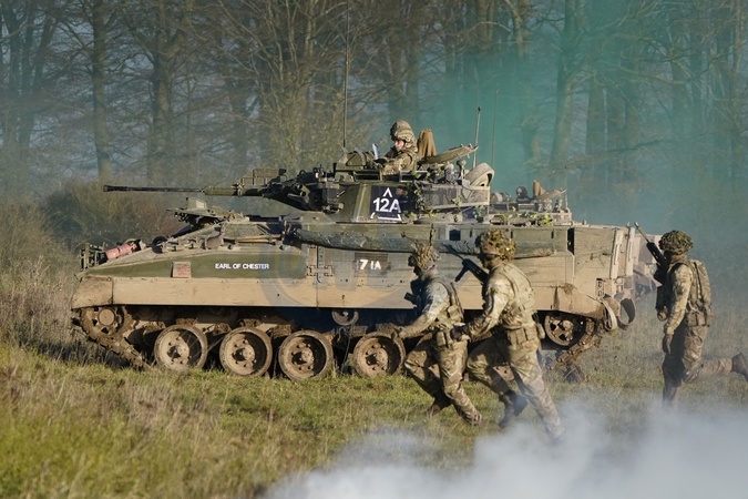 The Prince of Wales, Colonel-in-Chief, 1st Battalion Mercian Regiment, rides in an armoured vehicle while on a training exercise during a visit to the regiment, in the south west of the UK, for the first time following his appointment to the role by King Charles III., Credit:Andrew Matthews / Avalon