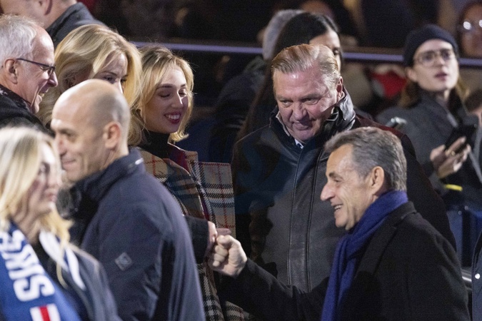 Nicolas Sarkozy, Charles de Bourbon des Deux-Siciles, Maria-Chiara de Bourbon des deux Siciles et Maria-Carolina de Bourbon des deux Siciles dans les tribunes lors du match de Ligue 1 Uber Eats "PSG - Monaco (5-2)" au Parc Des Princes, le 24 novembre 2023. © Cyril Moreau/Bestimage Celebrities in the stands during the match of Ligue 1 Uber Eats "PSG - Monaco (5-2)" at the Parc des Princes. Paris, November 24th, 2023.