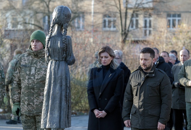 KYIV, UKRAINE - NOVEMBER 25, 2023 - President of Ukraine Volodymyr Zelenskyy and his spouse Olena Zelenska (middle) face the Bitter Memory of Childhood monument at the National Museum of the Holodomor-Genocide on Holodomor Remembrance Day, Kyiv, capital of Ukraine. On the fourth Saturday of November, Ukraine commemorates the victims of the Holodomor, the 1932–33 man-made famine that killed millions., Credit:Kirill Chubotin / Avalon